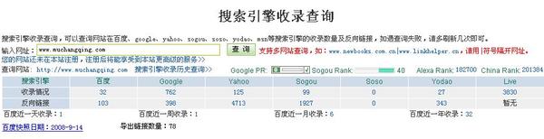 通過(guò)上圖可以看到,我鏈接的網(wǎng)站對(duì)方的百度收錄情況,對(duì)方的PR值情況,對(duì)方首頁(yè)內(nèi)頁(yè)是否掛了我的鏈接,掛的關(guān)鍵詞是什么,是在對(duì)方外鏈第幾的個(gè)位置,對(duì)方最近的百度快照日期又是多少,這些這些都是交換友情鏈接衡量SEO效果的標(biāo)準(zhǔn)。有了這個(gè)工具,交換再多友情鏈接都不怕沒(méi)時(shí)間檢查了。我現(xiàn)在就每周檢查一次,發(fā)現(xiàn)有提示沒(méi)有掛我的網(wǎng)站,就去實(shí)際檢查下,確認(rèn)對(duì)方去掉了,我這邊也就相應(yīng)的去掉。該網(wǎng)站地址: