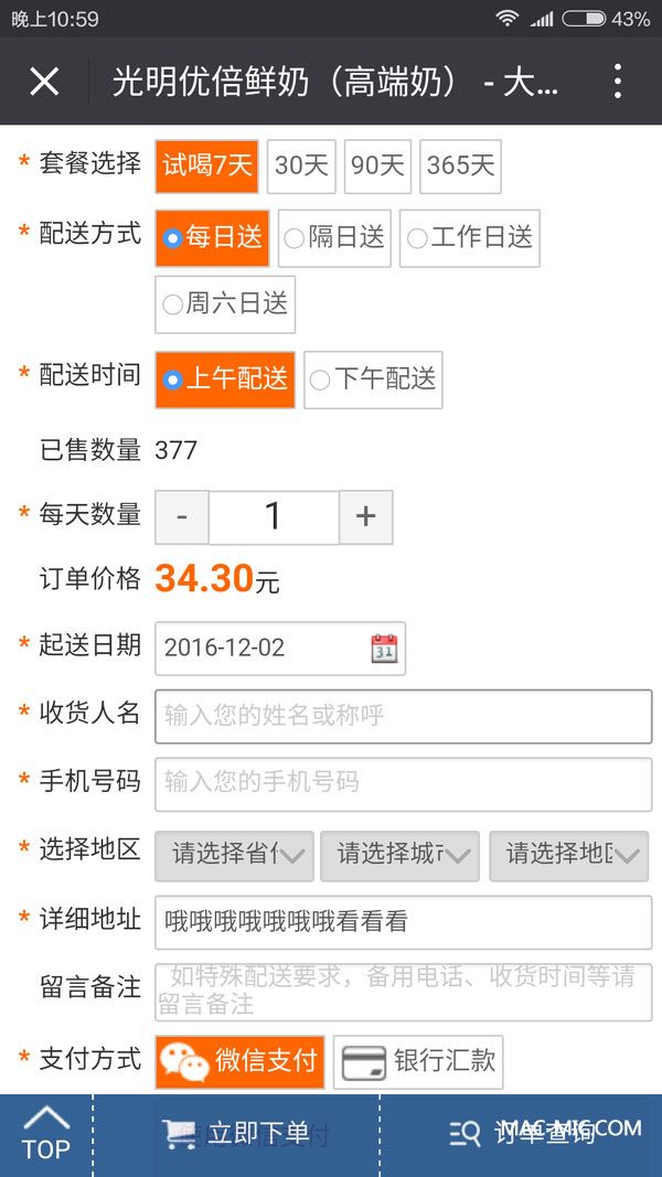 第二步:點(diǎn)擊“在線訂購(gòu)”,確定訂購(gòu)數(shù)量、價(jià)格、種類、起送時(shí)間、配送地址等信息,下單后微信付款。