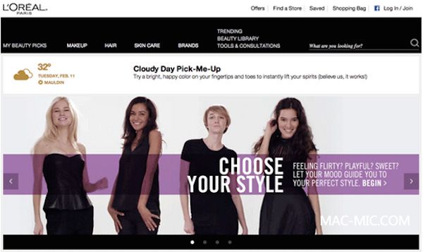 所以,如果你的設(shè)計(jì)是針對女性的,那么紫色會是一個相當(dāng)不錯的選擇,因?yàn)樽仙谂允鼙娭衅毡槭軞g迎,但是對于多數(shù)男性而言,紫色并不太受歡迎。在下方的圖片中,紫色被運(yùn)用在巴黎歐萊雅的網(wǎng)頁中,效果非常不錯。主體使用的黑白配色,黑色的頁頭頁腳看起來非常優(yōu)雅,紫色點(diǎn)綴其中,整體感非常不錯。實(shí)際上他們的產(chǎn)品并不便宜,但是給人感覺比較高端。