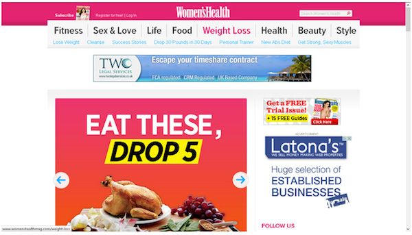 下圖是女性健康雜志的頁面,上面的Banner使用了粉紅色,導(dǎo)航設(shè)計(jì)更為大膽,除此以外網(wǎng)站其他的地方用色倒并不豐富。不得不說這樣的選擇非常有趣。